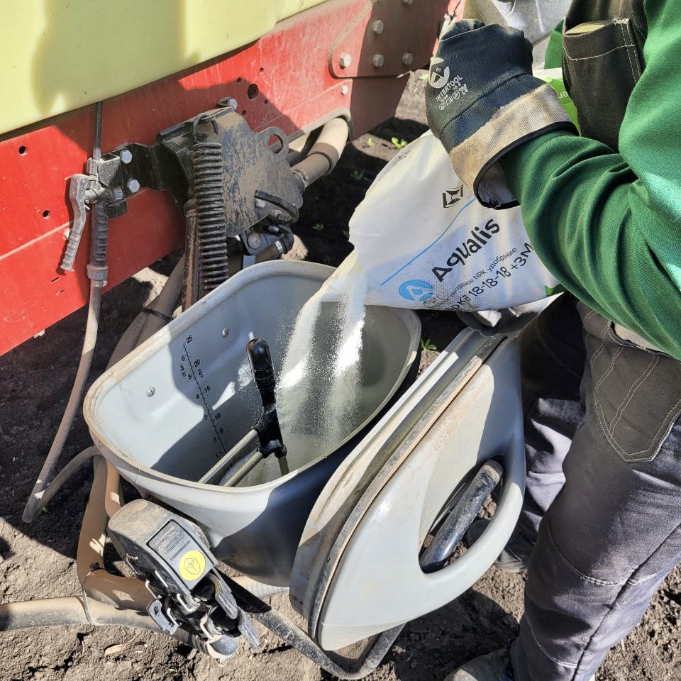 Погода в Усть-Лабинском районе на момент начала опыта хорошая, солнечная, днем до +25, практически без ветра, поэтому минеральное питание вносится утром, до жары☀️