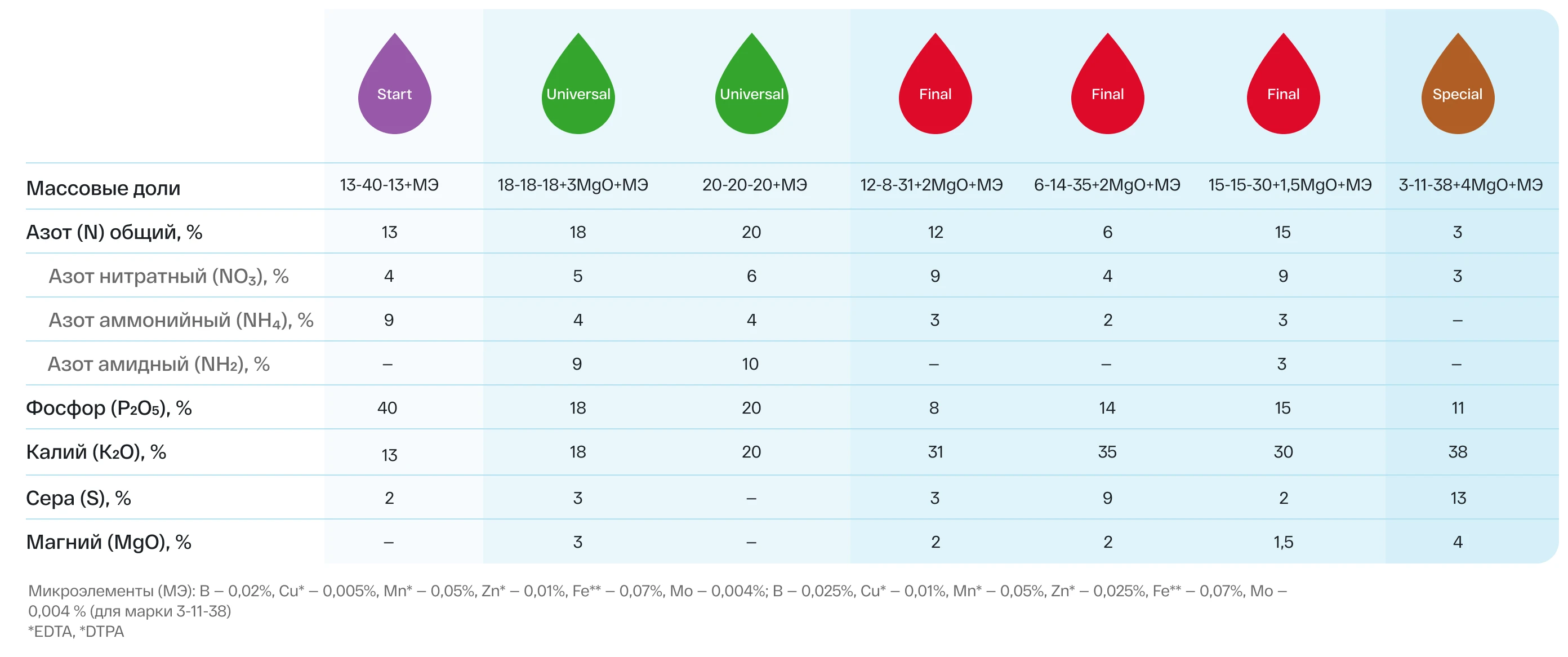 Водорастворимые формуляции обеспечивают точное дозирование и оперативное питание растений при капельном орошении и листовом питании.